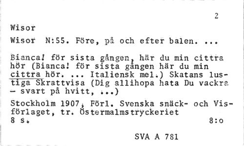 //// 1 //// Wisor //// Wisor N:55. Före, på och efter balen. ... //// Bianca.' för sista gången, här du min cittra hör (Bianca! för sista gången här du min cittra hör. ... Italiensk mel.) Skatans lustiga Skrattvisa (Dig allihopa hata Du vackra - svart på hvitt, i..) //// Stockholm 1907 * Förl. Svenska snäck- och Visförlaget, tr* Östermalms tryckeriet 8 Sé 8:o //// SVA A 781 3 ////