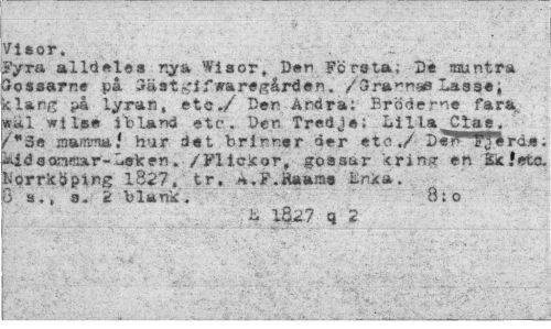//// Visor. - //// Fyra alldeles nya Wisor, Den Första, De muntra //// Sossarne på 3ä st g i f wa re gård e n. /Sra^nae Lasse; //// j-å lyran, etc,/ Den Andra: Bräde me fara irai.wtlae ibland etc. Den Tredje: Lilla Clas. /*3e mamma.' hur det brinner der etc./ Der* J'jerd.«; ä! da ömmar-Lek en. /Flickor, gossar "crircsr en BäcJetc. Norrköping 1827, tr, A.F.Äamiaa £nka. 5's., s. 2 blank . 8: o //// b 1827 q 2 ////