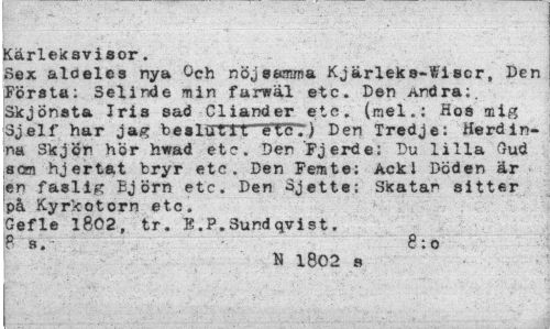 //// Kärlekavi sor. //// Sex alöelea nya Och nöjsamma Kjärleks-Wiser, Den Första: Selinde min farwäl etc. Den Andra:. Skjönata Jris sad Cliander etc. (mel.: Hos mig Sjelf har ja^ beslutlt etc".) Den Tredje: Herdin-na Skjön hör hwad etc. Den Fjerde: Du lilla Gud som hjertat bryr etc. Den Femte: Ackl Döden är en faslig Björn etc. Den ojette: Skatan sitter på Kyrkotorn etc. Gefle 1802, tr. B.P.Sundqvist. 8 a. 8: o //// H 1802 B ////