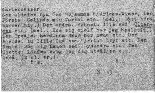 //// ^ , Z - • i //// .Kärleksvisor. //// Sex &14.e.l«s:-ny* Seh nöjsamma K£&*lek Den- //// för»ta: SelinÄe min farväl etn. (mel.; Lätt höra. vänner; »in») Den a ra* ra; Skön® ta Jr i* »ad Clian» ¦£kå eté.* {mél+i .Kos nig piftif har ^ag Den Tredje: Strilrm - l*ti» -fre* hwaa etc. Den //// .Du im^l i«cv,^rtat bryr etW Dan F«t*: 3% njig Datnon sad: Lyfcardra etc, Dan & 3 .jette; Ljufva sk cg jag dig ut väl; er (2 oi. trj //// P H g • C . //// ¦i' - S»: -.i-,»sas -.-..v/ ¦. 3 V'3-.wj //// . . V. • //// ¦ //// ife IIIMP-^-: ////
