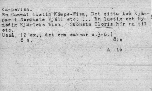 //// Kärcpevisa. //// Fn Gammal lustig Kämpe-Wisa, Det sitta twå Kjäm-par i Nore aste Fjäll etc. ... Tvn lustig och Nymod ig Kjärleks ffi»a. ' Skönsta Cloris ht-r nu til etc. //// Ueoå, (2 ex», det ena saknar s .3-6.) //// 8 ». 8:o //// A 16 ////