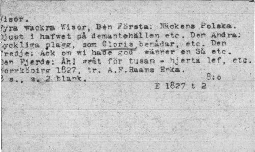 //// fiaOr. //// fyra vackra Wisor, Ben Första: Näckars Polska. >jupt i hafwet på deraantehälten etc. Der» Andra; -lyckliga plagg, som Cloris "benådar, etc. Den 'redje; Ack om wi haUe sfcd' wänner en 3å etc. ¦)er Pjerde; Åhi «r4t Tor tusan - hjerta lef, etj. ?orrkÖoi'"<r 1.827, tr. A.F.Haams S«ka. s., 3. 2 blank. 8; o //// 2 1827 t 2 ////
