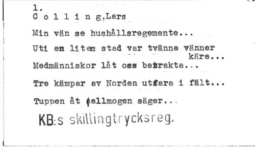 //// 1. //// G o 1 1 i n g,Lars //// Min vän se hushållsregemente... //// Uti en liten stad var tvänne vänner //// kära... //// Medmänniskor låt oss betrakta... Tre kämpar av Norden utfara i fält... Tuppen åt ^allmogen säger... //// KB:S skillingtrycksreg. ////