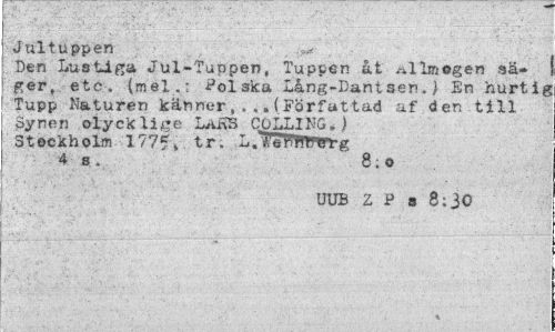 //// Jultuppen //// Den Lustiga Jul-Tuppen, Tuppen åt Allmogen sä» ger, etc. (mel.: Polska Lång-Dantsen.) En hurtig Tupp Naturen känner(Författad af den till Synen olycklige LaKS COLLIMG.) Stockholm 1775» tr. L.TeHfWvrg //// 4 s . 8 ; o //// UUB Z P s 8:30 ////