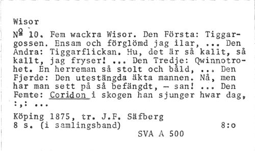 //// Wisor //// N- 10. Fem wackra Wisor. Den Första: Tiggargossen. Ensam och förglömd jag ilar, ... Den Andra: Tiggarflickan» Hu, det är så kallt, så kallt, jag fryseri ... Den Tredje: Qwinnotro-het. En herreman så stolt och båld, ,.„ Den Fjerde: Den utestängda äkta mannen. Nå, men har man sett på så befängdt, - san! ... Den //// Femte: Goridon i skogen han sjunger hwar dag, • f • « • » //// Köping 1875, tr. J.F. Säfberg 8 s. (i samlingsband) 8:o //// SVA A 500 ////