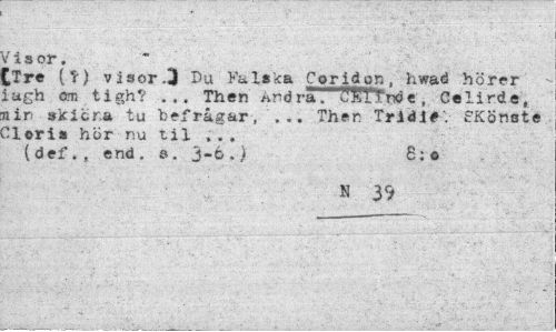 //// / i s or. //// [Tre (?) visor .3 Du'Falska Coridon, hwad hörer iagh om tigh? ... Then Andra. G&irtrfe, Celirde, din ¦ skitra tu befrågar, ... Then Tridi*. £Könste ^loris hör nu til ... //// (def. , end. s. 3-6 .) £;© //// N 39 ////