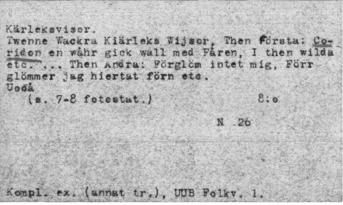 //// 'Kärleksvisor. //// Twennt Wackra Kiärleks Wijsor, Then företa; gp-ridon en wahr gick wall med Fåren, I then wilda etc"; ., Then Andra: Förglöm intet mig, SÖ riv -glömmer jag hiertat förn eta. Uodå //// (a. 7-8 f ©testat.) 8:0 //// ¦ ; :'*'" K -26 //// . ¦ ¦.'-, ¦ g; • *" " ¦ ^V "V" ' ' **" * • ~ sV //// Kompl. ex. (annat tr,), UUB Folk v, I. ////