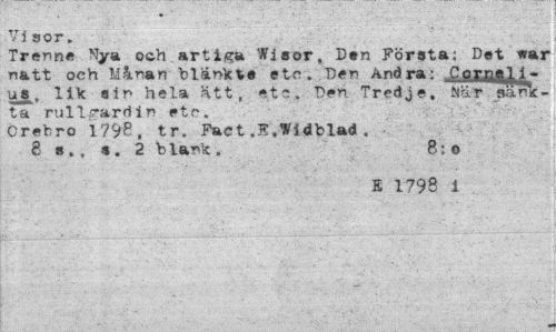 //// Visor. //// Trenne %a och artiga Wisor, Den Första: Det t»ar natt och Månan "blänkte etc. Den Andra: Comf^i- //// ug. lik sin hela ätt, etc. Den Tredje, Mar sans- //// ta rullgardin etc. //// Crebro 1798, tr. Fact.E.Widblad. //// 8 s » , s . 2 b länk . 8; o //// K 1798 i ////