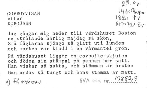 //// COVBOYVI SAN ' f fr' ^vkv //// eller tfcfc: t/- //// KOBOJSEN //// Jag gångar mig neder till värdshuset Boston en strålande härlig majdag så skön, Små fåglarna sjöngo så glatt uti lunden och marken var klädd i en vårmantel grön. //// På värdshuset ligger en covpojke skjuten och döden sin stämpel på pannan har satt. Han viskar så sakta, och stämman är bruten //// Han andas så tungt och hans stämma är matt. *) SVA ccc. nr../.?.?!?;.? ////