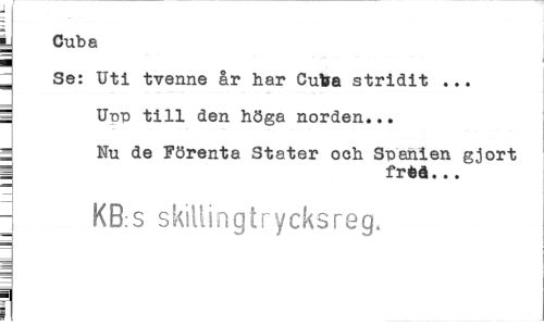 //// I //// L Cuba //// _ Se: Uti tvenne år har Cufca stridit ... //// I Utdp till den höga norden... //// 5 Nu de Förenta Stater ooh Spanien gjort //// i fréå... //// - KBs skillingtrycksreg. //// i ////
