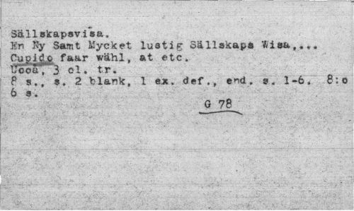 //// Sällskapsvisa, //// Kr» Ny Samt Mycket lustig Sällskaps ifcisa,... rugig.fr faar wähl, at etc, tfooa, 3 el. tr. //// P s., s. 2 blank, 1 ex» def., end. s. 1-6. 8:o ////