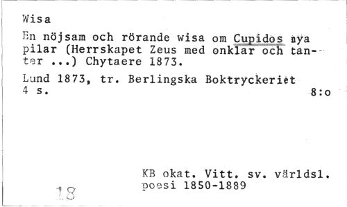 //// Wisa //// En nöjsam och rörande wisa om Cupidos aya pilar (Herrskapet Zeus med onklar och tanter ...) Chytaere 1873. //// Lund 1873, tr. Berlingska Boktryckeriet 4 s. 8:o //// KB okat. Vitt. sv. världsl. , Q poesi 1850-1889 //// ¦ o ////
