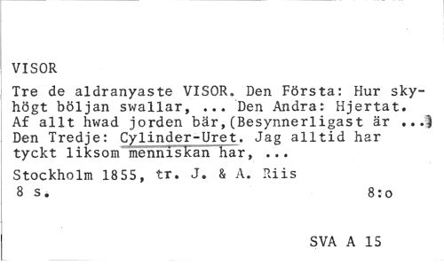//// VISOR //// Tre de aldranyaste VISOR. Den Första: Hur skyhögt böljan swallar, ... Den Andra: Hjertat. Af allt hwad jorden bär,(Besynnerligast är ...| Den Tredje: Cylinder-Uret. Jag alltid har tyckt liksom menniskan har, ... //// Stockholm 1855, tr. J. & A. Riis 8 s. 8:0 //// SVA A 15 ////