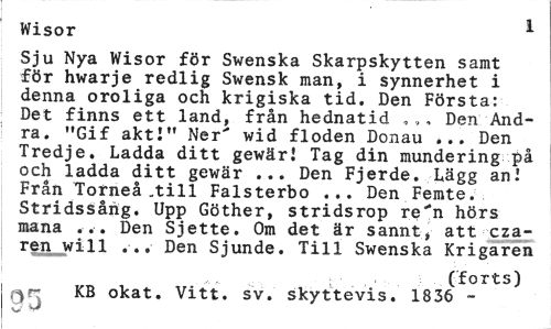 //// Wisor 1 //// Sju Nya Wisor för Swenska Skarpskytten samt för hwarje redlig Swensk man, i synnerhet i denna oroliga och krigiska tid. Den Första: Det finns ett land, från hednatid ,,, Den Andra. "Gif akti" Ner' wid floden Donau ... Den Tredje, Ladda ditt gewärj Tag din mundering på och ladda ditt gewär ... Den Fjerde. Lägg an! Från Torneå .till Falsterbo ... Den Femte. Stridssårig. Upp Göther, stridsrop re'n hörs mana ... Den Sjette. Om det är sannt, att cza-ren will ... Den Sjunde. Till Swenska Krigaren //// (forts) //// r-*rr KB okat. Vitt. sv. skyttevis. 1836 - //// CS si ////