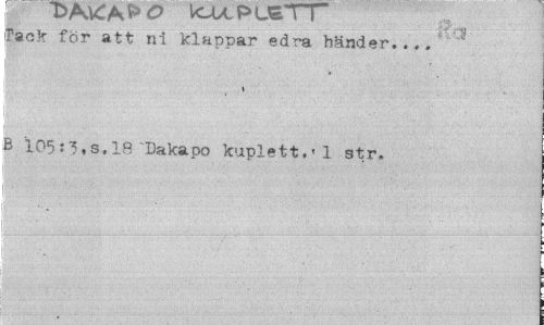 //// g 1cu.pueTT //// Fack för att ni klappar edra händer... //// t //// B 105:3,3.18 Dakapo kuplett.'1 str. ////