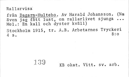 //// Rallarvisa //// från Dagarn-Hultebo. Av Harald Johansson. (Nu även jag fått lust, om rallarlivet sjunga .., Mel.: En kall och dyster kväll) //// Stockholm 1915, tr. A.B. Arbetarnes Tryckeri 4 s. 8:0 //// 1 //// >Ki KB okat. Vitt. sv. arb . ////