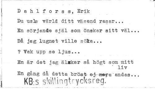 //// Dahlfors s, Erik Du usle värld ditt väsend rasar... En sörjande själ som önskar sitt väl... Då jag lugnet ville söla... i ? Vak upp se ljus... //// En är det jag älskar så högt som mitt //// ' liv //// En gång då detta hr ös t- ej- o»? a andas... //// [ KB.s skillingtrycksreg. ////