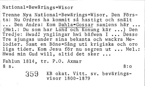 //// National=Bewärings=Wisor //// Trenne Nya National=Bewärings=Wisor. Den Första: Nu Ordres ha kommit så hastigt och snält ... Den Andra: Kom Dahla-Gossar samlens här ... (Mel.: Du som har Land och Konung kär ...) Den Tredje: HwadJ ynglingar hwi bäfwen I ... Desse Tre sjungas under sina bekanta och \^ackra Melodier. Samt en Böne=Sång uti krigiska och oro liga tider. Kom Jesu för nu segren ut ... Mel.: Hwad min Gud will, altid det sker ... //// Fahlun 1814, tr. P.O. Axmar 8 s. 8:0 //// 359 KB okat. Vitt. sv. bevärings- //// visor 1800-1879 ////