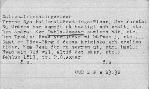 //// Nät i t;n&i -b e vari ngsv i a or //// Trenne Kya Katior.al-Bew&ri ngs-Wi s»r, Der. Första; Ku Ordr^» Har kamnit öå hastigt och snält, etc, Den Andra Kom Dahla-Gossar aufnlens här, etc. Der, Tredje: Hwad IF^ar wi bäfwen j, etc...» //// Samt er Föne-Sång i dessa krigiska och oroliga tider. Kom Jesu fcr ru se gr en ut, et.c. (mel.; Hwaö min Gud wils altid (Jet sker, etc.) Fahiun 1813, tr» P.O.Axmar //// 8s. B;o //// UUE Z P s 23;32 ////