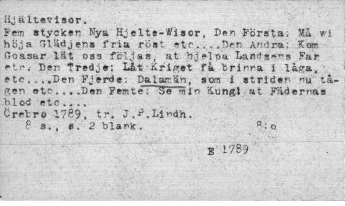 //// Hjältevisor. //// Fem stycken Nya Hjelta-tfiscr, Den Första, Mu vi höja Glädjens fria röst. etc. .> „T><?a Andra; Kom Gossar lät 033 följas, at hj »1 oa Lands*>"s Far etn.- Den tredje; Låt Kriget få brinna i låga, etc...Den Fjerde; Dalamän, som i strider- nu tågen etc. ...Den Femte"; Se min Kungi at Fädernas Mod etc ... //// CreVro 1789, tr. J.J?.Li«dh. //// P a. , 0.' 2 blank. o //// E i'759 ////
