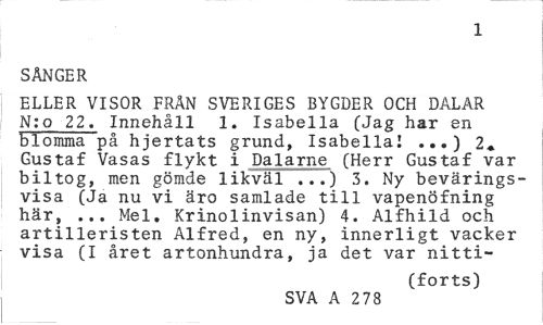 //// 1 //// SÅNGER //// ELLER VISOR FRÅN SVERIGES BYGDER OCH DALAR N:o 22. Innehåll 1. Isabella (Jag har en ET omma på hjertats grund, Isabella! ...) 2* Gustaf Vasas flykt i Dalarne (Herr Gustaf var biltog, men gömde likväl .) 3. Ny bevärings-visa (Ja nu vi äro samlade till vapenöfning här, ... Mel. Krinolinvisan) 4. Alfhild och artilleristen Alfred, en ny, innerligt vacker visa (I året artonhundra, ja det var nitti- //// (forts) //// SVA A 2 78 ////