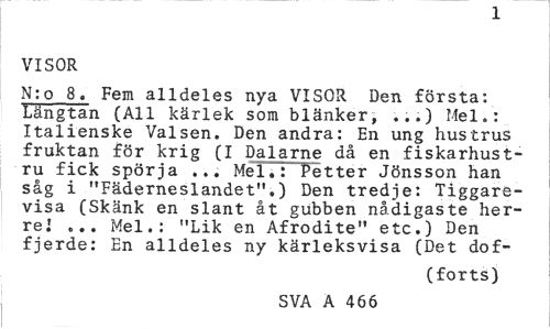 //// 1 //// VISOR //// N:o 8. Fem alldeles nya VISOR Den första: Längtan (All kärlek som blänker, ...) Mel.: Italienske Valsen. Den andra: En ung hustrus fruktan för krig (I Dalarne då en fiskarhustru fick spörja ... Mel.: Petter Jönsson han såg i "Fäderneslandet".) Den tredje: Tiggarevisa (Skänk en slant åt gubben nådigaste herre] ... Mel.: "Lik en Afrodite" etc.) Den fjerde: En alldeles ny kärleksvisa (Det dof- //// (forts) //// SVA A 466 ////