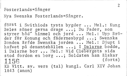 //// 2 //// Fosterlands=Sånger //// Nya Swenska Fosterlands=Sånger. //// först i Swithiods tysta bygder ... Mel.: Kung Beles söner gerna dragé Du Fader, som //// styrer båd" himmel och jord ... Mel.: Upp Bröder för Konung och fädernesbygd ...; Swenska Bonden ärfde Swenska jorden ... Mel.: Djupt i hafwet på demantehällen ...; I Dalarne bodde, i Dalarne bor ... Mel.: Wid Clebergets sida stod fordom en borg ...; Soldaten han älskar //// 1156 * (£orts) //// KB Vitt. sv. vers (tal) kungl. Carl XIV Johan 1843 (anon) ////