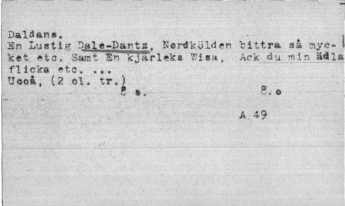 //// Daldan». //// Bn Lustig Dalc-Dartz. NcrdkÖlden tittra sa mycket <»tc. Särat En jarleks 7,'isa, Ack du rnln ädla flicka etc. ... Uooa, (2 öl. tt.) //// t S. C.o //// A 49 ////