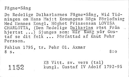 //// Fägne=Sång //// De Redelige Dalkarlarnes Fägne=Sång, Wid Tidningen om Hans Haj: t Konungens Höga Förlofninj* Med Hennes Kongl. Höghet Prinsessan LOVISA CHARLOTTA, (Den Redelige Dalkarins röst Från _ hjertat ...) Sjunges som: War Kung wår Gustaf se dit folk ... Författad af Knut Pehr Persson. //// Fahlun 1795, tr. Pehr 01. Axmar 8 s. 8:o //// KB Vitt. sv. vers (tal) 1152 kungl. Gustaf IV Adolf 1792-95 ////