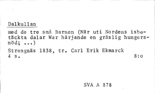 //// Dalkullan //// med de tre små Barnen (När uti Nordens isbe-täckta dalar War härjande en gräslig hungersnöd; ...) //// Strengnäs 1838, tr. Carl Erik Ekmarck 4 s. " 8:0 //// SVA A 878 ////