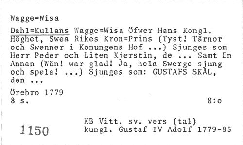 //// Wagge=Wisa //// Dahl=Kullans Wagge=Wisa Öfwer Hans Kongl. Höghet, Swea Rikes Kron=Prins (Tyst.1 Tärnor och Swenner i Konungens Hof ...) Sjunges som Herr Peder och Liten Kjerstin, de ... Samt En Annan (Wänl war gladI Ja, hela Swerge sjung och spela! ...) Sjunges som: GUSTAFS SKÄL, den ... //// Örebro 1779 //// 8 s. 8:0 //// iicri KB Vitt. sv. vers (tal) //// 1.1150 kungl. Gustaf IV Adolf 1779-85 ////