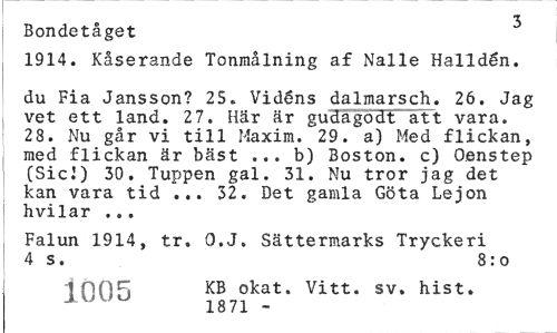 //// ¦t //// Bondetåget //// 1914. Kåserande Tonmålning af Nalle Halidén. //// du Fia Jansson? 25« Vidéns dalmarsch. 26. Jag vet ett land. 27. Här är guciagodt att vara. 28. Nu går vi till Maxim. 29. a) Med flickan, med flickan är bäst ... b) Boston, c) Oenstep (Sic!) 30. Tuppen gal. 31. Nu tror jag det kan vara tid ... 32. Det gamla Göta Lejon hvilar ... //// Falun 1914, tr. O.J. Sättermarks Tryckeri 4 s. 8: o //// 1 PO^J KB okat. Vitt. sv. hist. //// 1871 - ////