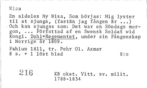 //// V/i s a //// En aldeles Ny Wisa, Som börjas: Mig lyster til at sjunga, (fastän jag fången är ...) Och kan sjungas som: Det war en Söndags morgon, ... Författad af en Swensk Soldat wid Kongl. Dahl=Regementet, under sin Fångenskap i Norrige år 1809. //// Fahlun 1811, tr. Pehr 01. Axmar 8 s. + 1 löst blad 8:o //// 216 KB okat. Vitt. sv. milit. //// 1788-1834 ////