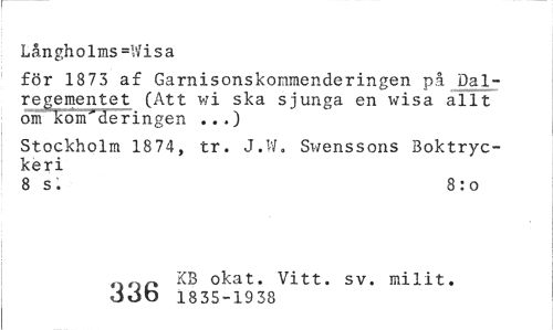 //// Långholms=Wisa //// för 1873 af Garnisonskommenderingen på Dalregementet (Att wi ska sjunga en wisa allt om kom^deringen ...) //// Stockholm 18 74, tr. J.W. Swenssons Boktryckeri //// 8 s . 8 : o //// o oo °kat. Vitt. sv. milit. JOD 1835-1938 ////