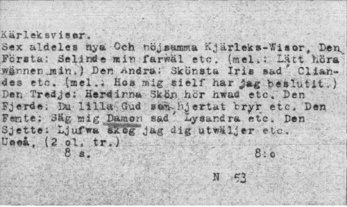 //// Kärleksvisor. //// öex aldeles hy a Och nöjaamma Kjärleks-Wisor, Der^ Fcrata: Selinde min farwäl etc. (mel.; Lätt höra jfffinneri .jain.) Den /»ndr»; Skonsta Iria »ad ' Cli&n-des etc. (mel.; Koa .nig eielf har beslutit,} Den Tredje; Herdirna Sk&p. hör hwad etc. Den Fjerde; Du lilla Gud 3<*n-.ertat bryr etc. Den Fente; 3äg a i g Damon sad ' Lya ar.dra etc. Den Sjette; Ljufwa "BTSg^J&g dig utväljer etc. Ueeå, (2 ol, tr.) //// 8 a. 8;© . //// • >,/>.-/; ; ; ¦ N -3 : - ////