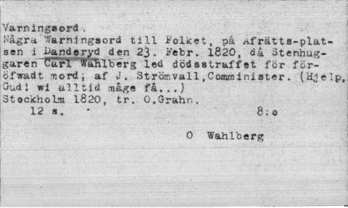 //// Varningsord , //// Några 'Varningsord till Folket, på Af rätta-platsen i Danderyd den 23. Febr. 1820, di Stenhuggaren Pari. WaRlberg led dödsstraffet för för-öfwadt mord, af J. Strömvall,Comminiater. (Hjelp, Oud1 wi alltid måge få...) Stockholm 1820, tr. O.Grahn. //// 12 s. B;o //// O Wahlberg ////