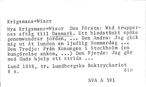 //// Krigsmans=Wisor //// Nya Krigsmans=Wisor Den Första: Wid truppernas aftåg till Danmark. Ett blodstänkt spöke genomwandrar jorden, ..» Den Andra: Jag gick mig ut åt lunden en ljuflig Sommardag ... Den Tredje: Från Konungen i Stockholm (en kungörelse ankom, ...) Den Fjerde: Jag går med Guds hjelp att strida ... //// Lund 1848, tr. Lundbergska Boktryckeriet 8 s. 8:0 //// SVA A 391 ////