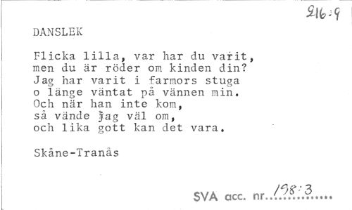 //// DANSLEK //// Flicka lilla, var har du varit, men du är roder om kinden din? Jag har varit i farmors stuga o länge väntat på vännen min. Och när han inte kom, så vände Jag väl om, och lika gott kan det vara. //// Skåne-Tranäs //// SVA cscc. nr.. ////