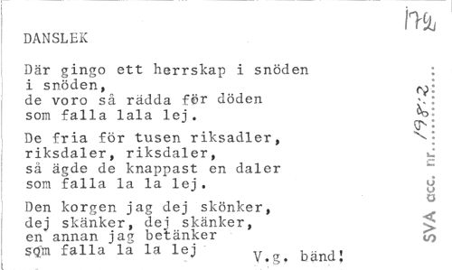 //// m //// DANSLEK //// Där gingo ett herrskap i snöden ; //// i snöden, //// de voro så rädda för döden > : //// som falla lala lej. //// De fria för tusen riksadler, \ • //// riksdaler, riksdaler, ^ //// sä ägde de knappast en daler som falla la la lej . //// Den korgen jag dej skönker, dej skänker, dej skänker, //// en annan jag betänker ^ //// stfm £alla"la la leJ v.g. bänd' ////