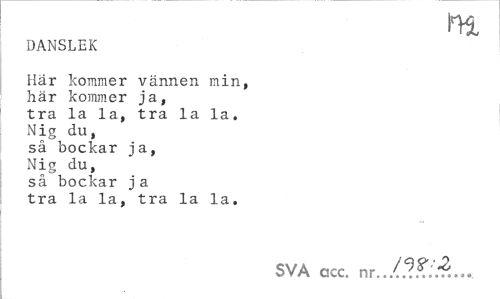 //// m. //// DANSLEK //// Här kommer vännen min, //// här kommer ja, //// tra la la, tra la la. //// Nig du, //// så bockar ja, //// Nig du, //// så bockar ja //// tra la la, tra la la. //// SVA cscc. nr.. ////