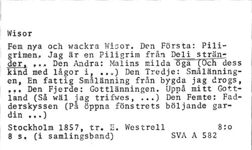 //// Wisor //// Fem nya och wackra Wisor. Den Första: Pili-grimen. Jag är en Piligrim från Deli stränder, ,., Den Andra: Malins milda öga (Och dess kind med lågor i, ..„) Den Tredje: Smålänningen, En fattig Smålänning från bygda jag drogs, Den Fjerde: Gottlänningen. Uppå mitt Gott-land (Så wäl jag trifwes, ...) Den Femte: Fadderskyssen (På öppna fönstrets böljande gardin //// Stockholm 1857, tr. E. Westrell 8:0 //// 8 s. (i samlingsband) SVA A 582 ////