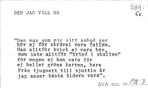 //// %<\> //// DEN JAG VILL HA gy //// "Den man som mi?r sitt anbud crer bör ej för skrävel vara fallen. Han alltför kvick ej vara bör, men inte alltför, "trind i skallen" för mogen ej han vara får ej heller gröna karten, bara Från tjugoett till sjuttio år jag anser bästa åldern vara". //// SVA ccc. nrZ/O. ////