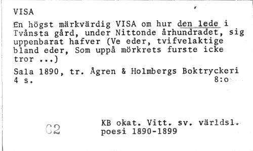 //// VISA //// En högst märkvärdig VISA om hur den lede i Tvånsta gård, under Nittonde århundradet, sig uppenbarat hafver (Ve eder, tvifvelaktige bland eder, Som uppå mörkrets furste icke tror ...) //// Sala 1890, tr. Ågren & Holmbergs Boktryckeri 4 s. 8:0 //// or. KB okat. Vitt. sv. världsl. //// .jtZ poesi 1890-1899 ////