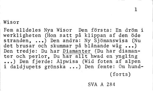 //// 1 //// Wisor //// Fem alldeles Nya Wisor Den första: En dröm i werkligheten (Hon satt på klippan af den öde stranden, ...) Den andra: Ny Sjömanswisa (Nu det brusar och skummar på blånande wåg ...) Den tredje: Du har Diamanter (Du har diamanter och perlor, Du har allt hwad en yngling ...) Den fjerde: Alpwisa (Wid foten af alpen i daldjupets grönska ...) Den femte: Om hund- //// (forts) SVA A 284 ////