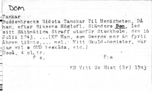 //// ^Tankar //// 'Buddenbrocks Sid3ta Tanckar Til Menigheten, Då han, efter Biksens Höglofl, Ständers Dem, led sitt Rättmätiga Straff utanför Stockholm, den 16 Julii 1-743. ,..(E>T Man, som Swerge mer är fyr t i åhren tiänte,.., mel." Mitt Skuld -Kegi ster, när -jag wl 1 o GTJD Ve skåda, etc.) = Uooå , 4 ol. tr . //// ! P s. P: o //// KB Vjtt Sv flist (Br) 1743 ////