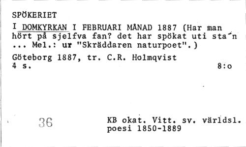 //// SPÖKERIET //// I DOMKYRKAN I FEBRUARI MANAD 188 7 (Har man hört på sjelfva fan? det har spökat uti sta"n ... Mel.: ut "Skräddaren naturpoet". ) //// Göteborg 1887, tr. C.R. Holmqvist 4 s. 8: o //// KB okat. Vitt. sv. världsl. poesi 1850-1889 ////