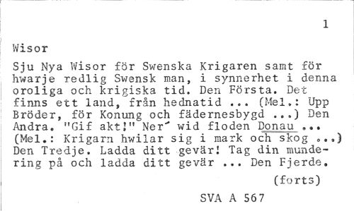 //// 1 //// Wisor //// Sju Nya Wisor för Swenska Krigaren samt för hwarje redlig Swensk man, i synnerhet i denna oroliga och krigiska tid. Den Första. Det finns ett land, från hednatid ... (Mel,: Upp Bröder, för Konung och fädernesbygd ..») Den Andra. "Gif akti" Ner' wid floden Donau (Mel.: Krigarn hwilar sig i mark och skog <,.,) Den Tredje. Ladda ditt gevär! Tag din mundering på och ladda ditt gevär ... Den Fjerde. //// (forts) //// SVA A 56 7 ////