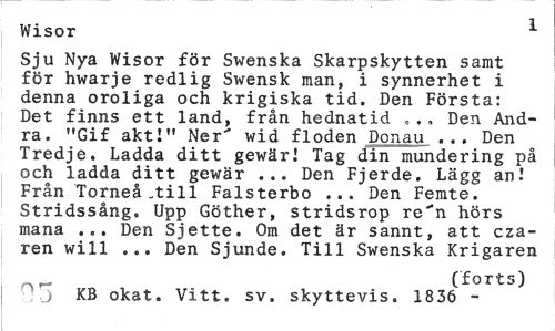 //// Wisor 1 //// Sju Nya Wisor för Swenska Skarpskytten samt för hwarje redlig Swensk man, i synnerhet i denna oroliga och krigiska tid. Den Första: Det finns ett land, från hednatid Den Andra. "Gif akt!" Ner' wid floden Donau ... Den Tredje. Ladda ditt gewärJ Tag din mundering på och ladda ditt gewär ... Den Fjerde. Lägg an! Från Torneå „till Falsterbo ... Den Femte. Stridssång, Upp Göther, stridsrop re'n hörs mana ... Den Sjette. Om det är sannt, att cza-ren will ... Den Sjunde. Till Swenska Krigaren //// ^ (forts) //// n;j KB okat. Vitt. sv. skyttevis. 1836 - ////