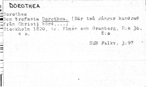 //// • . //// ^OfcOTUe^ //// i //// =r>orot.hea //// feen trofasta Dorothea. (Har twa gånger hund rad 3frin Christi hörd,... i , //// ^Stockholm 1820. tr . Fimen och Granberg, K; o 3°. ? <» a. 8; o //// TJ0E Felkv. 3-97 //// 1 f ////