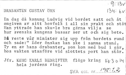//// : ! O v* //// DRABANTEN GUSTAV ÖRN bl/ //// En dag då konung Ludvig vid bordet satt och åt omgiven av sitt hovfolk i all sin prakt och stå" Han yttrade han sku-le bra gärna vilj a se hur svenska kungens bussar ser ut och sig bete. //// Då reste vår minister sig upp från bordets rund och sade:" Eder önskan kan ske i samma stund. Ty en av hans drabanter, som kom med bud i går, hos vakten utanföre vid slottets port han står. //// Jfr. KUNG KARLS BEDRIFTER flögo kring hela jordens ring. //// SVA c:c. nr ////